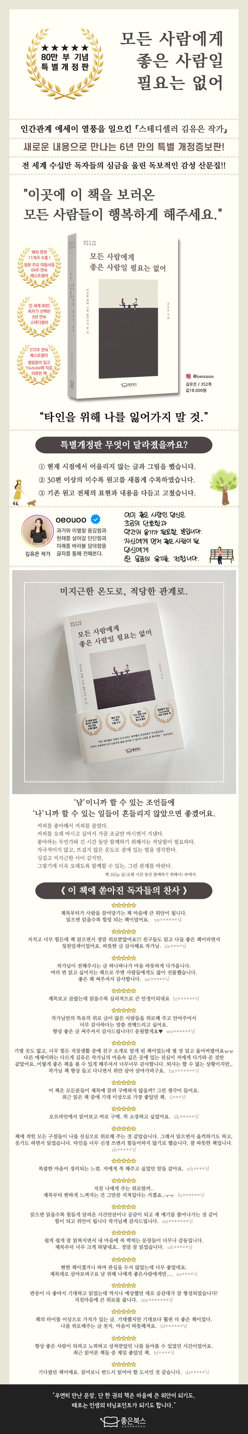 출간 이후 독자들에게 뜨거운 사랑을 받은 스테디셀러 『모든 사람에게 좋은 사람일 필요는 없어』가 독자들의 사랑에 보답하기 위해 특별개정판으로 새롭게 출간되었다. 특별개정판에는 30편 이상의 미공개 원고가 수록되었고, 기존 원고 내용이 전면 수정되었다. 저자가 오랜 시간 공들여 준비한 특별개정판인 만큼, 독자들을 향한 진심 어린 응원의 마음이 고스란히 전해지는 책이다.