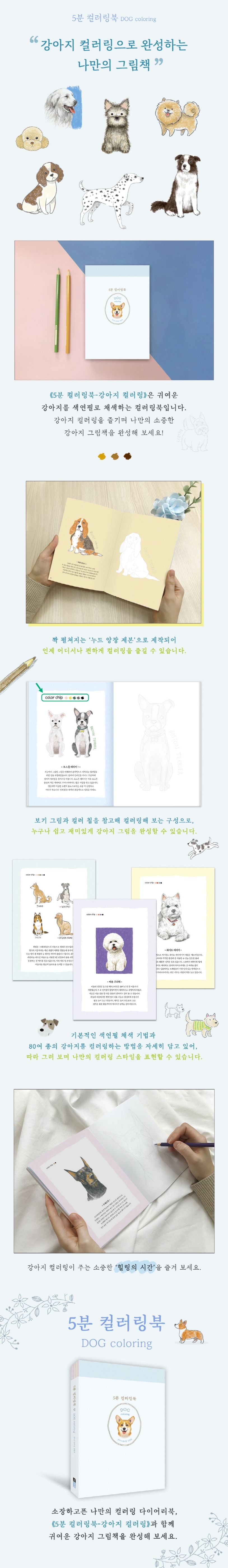 《5분 컬러링북-강아지 컬러링》은 귀여운 강아지를 색연필로 채색하는 컬러링북이다. 친근한 반려견 몰티즈부터 말썽꾸러기 비글과 코커 스패니얼, 훌륭한 사냥개 그레이하운드까지 80여 종의 강아지를 밑그림을 활용해 컬러링할 수 있다. 기본적인 색연필 채색 기법과 강아지의 특징을 살려 컬러링하는 과정을 단계별로 담고 있어, 다양한 강아지를 비롯하여 사랑하는 반려 강아지도 멋진 그림으로 표현할 수 있다.