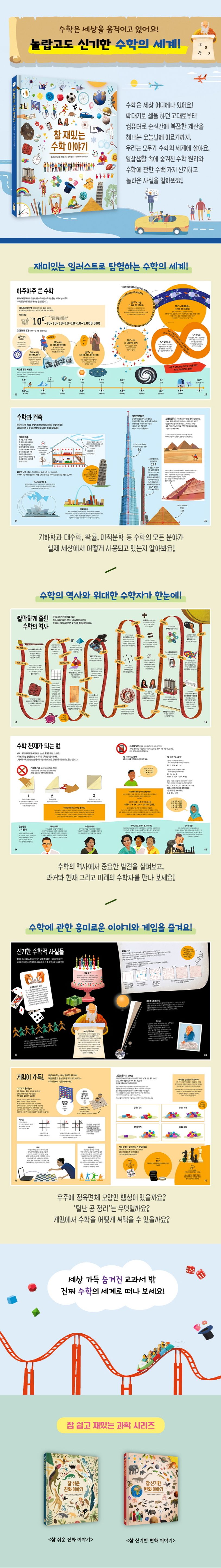 10억까지 세는 데는 얼마나 걸릴까요? ‘털난 공 정리’는 무엇일까요? 우주에 정육면체 모양인 행성이 있을까요? 수학은 우리 주위 어디에나 있고, 일상에서 우주에 이르기까지 온 세상을 움직이고 있습니다. 《참 재밌는 수학 이야기》는 기하학과 확률, 미적분학 등 수학의 모든 분야가 실제 세상에서 어떻게 사용되는지를 흥미로운 주제와 재미있는 일러스트로 풀어낸 수학책입니다. 쇼핑과 스포츠, 건축, 미술, 자연 등 일상 속에 담긴 수학 원리를 살펴보고, 수학의 역사에서 중요한 사건과 발견 그리고 세상을 바꾼 위대한 수학자들을 만납니다. 수백 가지 신기하고 놀라운 수학적 사실을 배우고 여러 가지 게임과 퍼즐에 도전해 보기도 합니다. 이 특별한 수학 안내서를 따라 세상 가득 숨겨진 교과서 밖 진짜 수학의 세계로 떠나 보세요!
