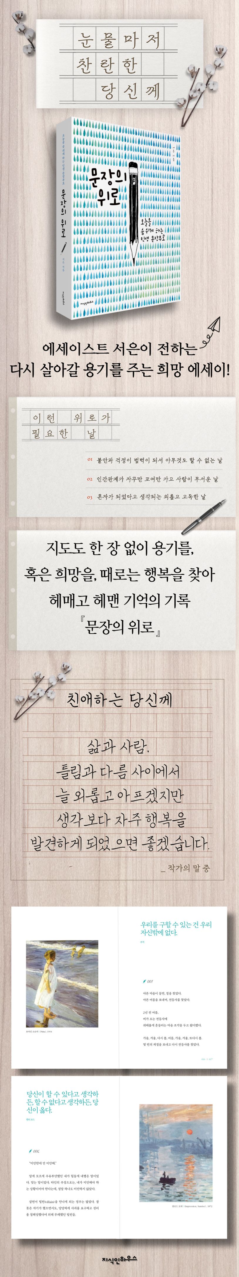 삶은 절대 공정하지만은 않았다. 사람은 절대 사랑스럽지만은 않았다. 삶은 생각보다 자주 환기가 필요했고, 사람 앞에서는 늘 각성해야 했다. 하지만 깨닫게 되는 것은, 언제나 느렸다. 작가의 삶은 더 그랬다. 다른 이보다 느릿한 삶의 보폭만큼 잃어야 하는 것은 많았고, 아파야 하는 것은 늘었다. 하지만 또 잃을 때마다 삶이 투명해진다고 믿었고, 아플 때마다 삶이 더 강해졌다 확신했다. “나를 죽이지 못하는 고통은 나를 더 강하게 만든다.”라는 철학자 니체의 말을 삶으로 증명하겠다는 듯이. 그리고 삶으로 증명하고 싶은 순간의 기록이 모여 『문장의 위로』가 되었다.