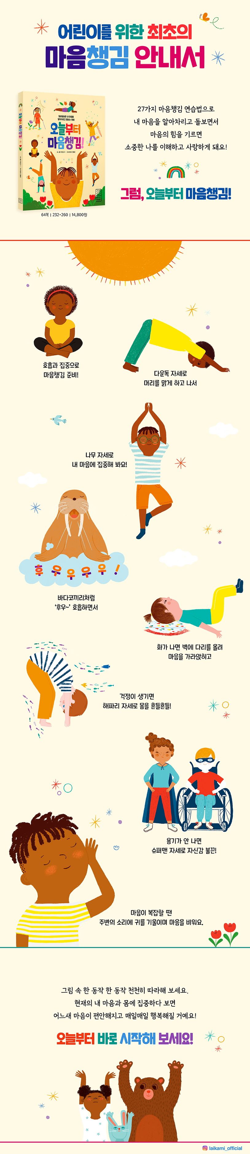 《오늘부터 마음챙김!》은 어린이를 위한 27가지의 마음챙김 연습 방법을 소개해요. 아이들은 어른들에 비해 자신의 생각과 감정을 알아차리고, 이를 표현하는 데 굉장히 서툴러요. 그래서 어린이들의 눈높이에서 이해할 수 있는 마음챙김 훈련법이 필요하지요. 이 책은 아이들이 쉽게 이해하고 따라 할 수 있도록 귀여운 그림과 친절한 설명으로 마음을 돌보는 방법을 알려 준답니다. 호흡과 집중을 기본으로, 요가와 명상을 차근차근 따라 하다 보면 화를 식히고, 긴장도 풀며, 용기를 얻고, 걱정을 떨쳐 낼 수 있게 돼요. 또 집중력, 창의력, 감수성이 커지고, 다른 사람의 감정에 공감하는 능력이 길러져 사회성도 쑥쑥 자라나요!