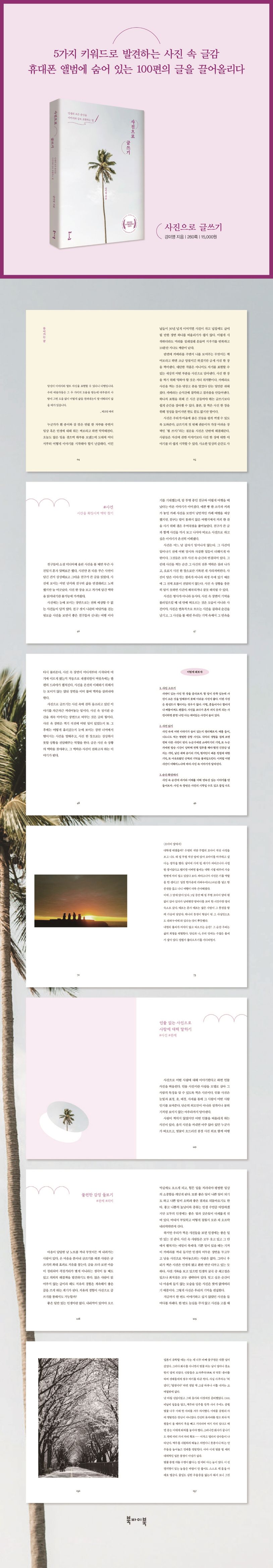2022년 우수출판콘텐츠 선정작으로, 사진상담심리사인 저자가 사진을 글감으로 삼아 인생의 모든 순간을 글로 표현하는 법을 알려주는 책이다. 수많은 장면 가운데 사람들에게 보여주고 싶은 이야기를 정리·편집하고 의미 있는 이야기로 완성하는 법을 소개한다. 1장에서는 사진으로 글쓰기의 필요성과 그 특징을 설명한다. 2장은 관찰, 사건, 관계, 추억, 의미, 이 다섯 가지 키워드를 중심으로 사진에서 글감 찾는 법을 제시하고 실제로 글을 써보도록 구성했다. 3장~6장에서는 예문을 통해 앞에서 말한 작법을 바탕으로 여행 사진, 인물 사진, 기록 사진, 일상 사진을 보고 어떻게 글을 쓸 수 있는지를 알려준다.