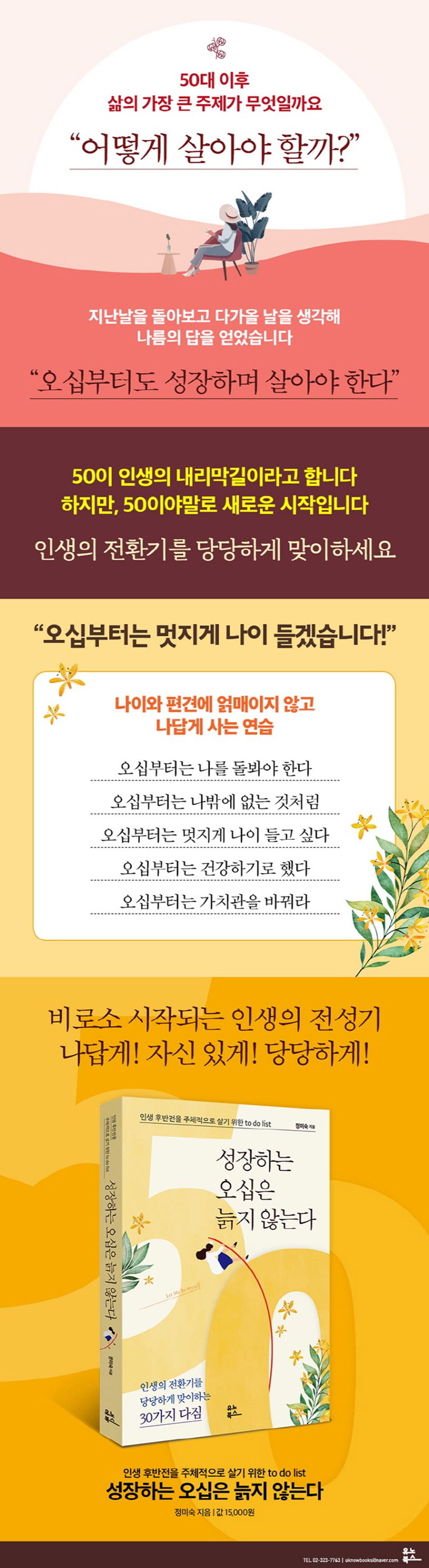 저자는, 50에도 성장하려는 열정의 몸가짐과 마음가짐을 지녀야 한다고 못 박는다. 50이 인생의 내리막길 아닌 새로운 시작이니 말이다. 나를 돌보고 가꾸며 주체적으로 살아가야 할 때다.