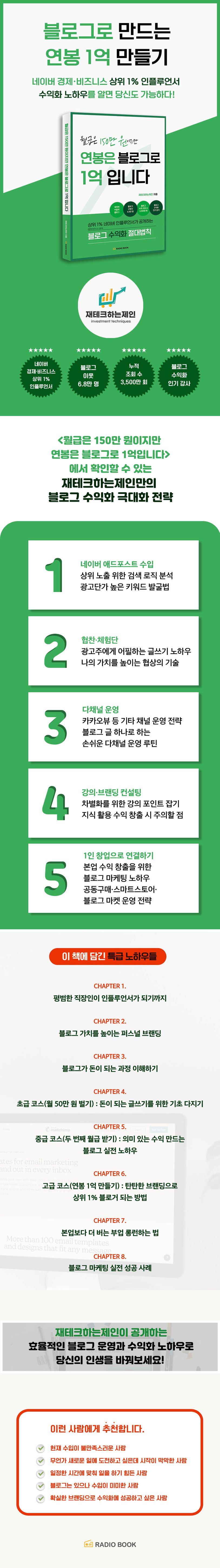 'CHAPTER 6. 고급 코스(연봉 1억 만들기) : 탄탄한 브랜딩으로 상위 1% 블로거 되는 방법'은 최상위 블로거인 저자가 제시하는 상위 1% 블로거 도약을 위한 브랜딩 전략을 제시한다. 블로그 기반의 1인 창업과 강의와 스터디, 브랜딩 컨설팅 등 지식으로 수익을 창출하는 노하우를 전한다.