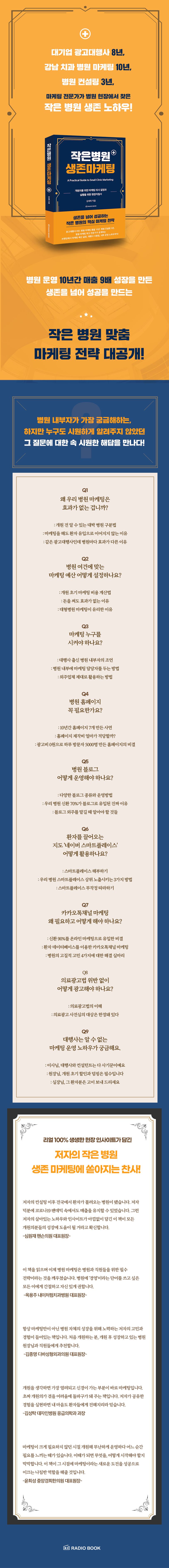 저자는 대학에서 광고를 전공하고 대기업 광고대행사에서 다년간 경험을 쌓은 광고 전문가였다. 그러다 치과의사인 남편이 강남에 무턱대고 개원을 한 탓에 병원 마케팅 세계에 발을 들였다. 그리고 그렇게 10년 동안 작은 병원을 생존시키고 성장시키기 위해 자신의 지식과 경험, 노하우를 쏟아부었다. 그리고 개원 10년 만에 매출을 9배 늘리고 성공적으로 병원을 양도해 '조기 개원 은퇴'라는 성과를 거뒀다. 모두 작은 병원에 맞는 마케팅 방법을 찾고 직접 실행하며 끊임없이 전략을 수정하며 만든 노하우 덕분이었다. 그리고 이제 이 경험과 노하우를 작은 병원 원장님들의 생존을 위해 아낌없이 공개한다.