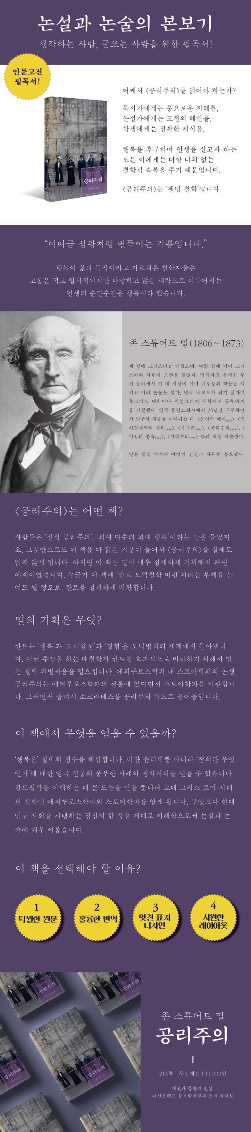 〈공리주의〉는 존 스튜어트 밀이 1861년 10월, 11월, 12월 세 차례에 걸쳐 영국 시사교양 잡지인 “프레이저스 매거진”에 기고한 글을 1863년에 묶어 펴낸 책이다. 밀을 일약 사상가의 반열로 올려놓은 이 책이야말로 인류의 모든 논설과 논술의 본보기이다.