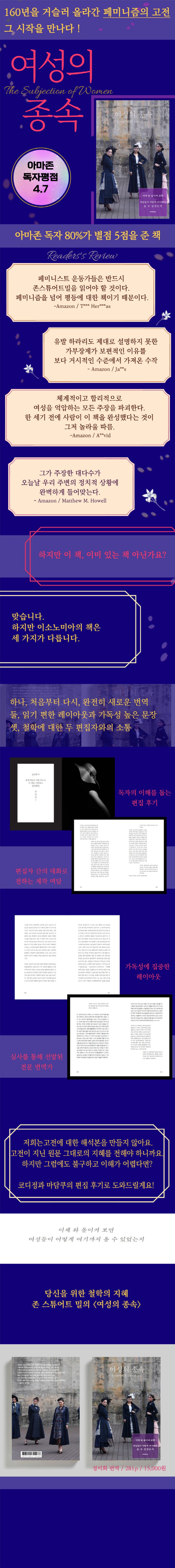 이 책은 19세기 영국을 대표하는 사상가 중 한 사람인 존 스튜어트 밀이 1869년에 저술한 〈THE SUBJECTION OF WOMEN〉을 번역한 책이다. 저자는 당시 사회의 관습과 금기에 도전하면서 여성 참정권 운동을 벌이기도 한 사람이고, 저자가 쓴 이 책은 정의와 공평의 관점에서 여성의 자유를 주장하지만, 〈여성의 종속〉을 ‘여성주의 책’이라고 단정하기는 어렵다. 우선 저자 본인이 그런 표현을 사용하지 않는다. 사회 운동을 주창하지도 않는다. 시종일관 인류의 관점으로 이야기를 풀어나간다. 그러나 이 책만큼 설득력 있는 여성주의 책이 또 있을까? 밀은 남자들이 지니고 있을 법한 사회통념을 전부 해부해 놓고서 그것의 유래와 증상을 차분히 분석하고 진지하게 해결책을 제시한다.