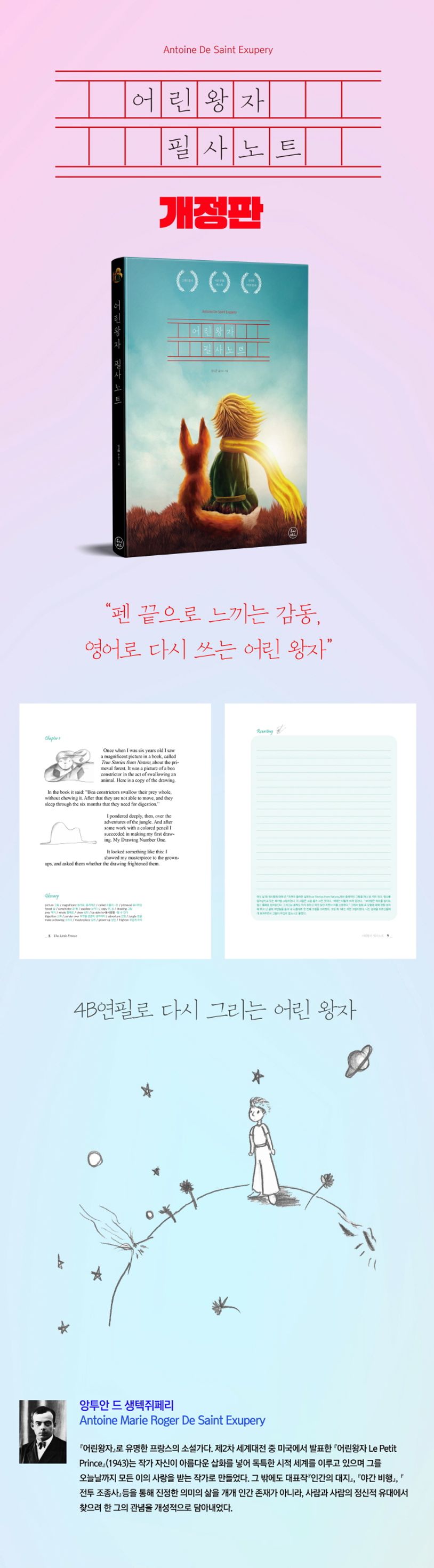 생텍쥐페리의 어린왕자 영문을 본문 삼아 필사하기 좋은 책. 간간이 어휘와 번역이 수록되어 있다. 아울러 벨벳 촉감으로 보드라운 표지에 4B연필 그림으로 감성을 더했다. 영어로 다시 쓰면서 어린왕자의 감동을 되새겨보자.
