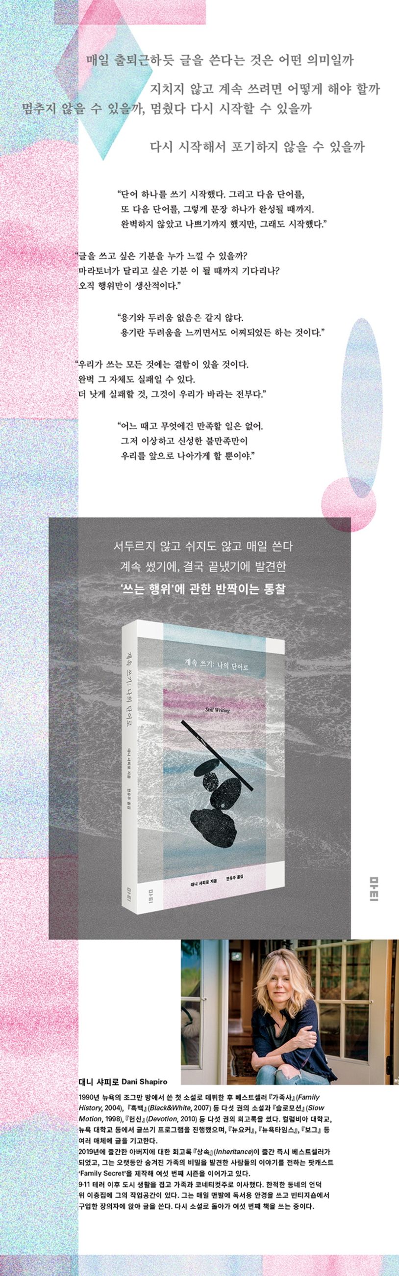 대니샤피로는이십대후반에첫소설로데뷔했다.그때부터작가라불리며지내온지20여년,어릴적부터매일글을쓰며살아온지40여년이지난무렵에쓴『계속쓰기』는그가작가로살아가는일,밤마다이불밑에서손전등을켜고상상으로가득한편지를끄적거리면서시작된글쓰는생활을톺아보며써내려간책이다.오로지계속썼기때문에나올수있었던책이다.