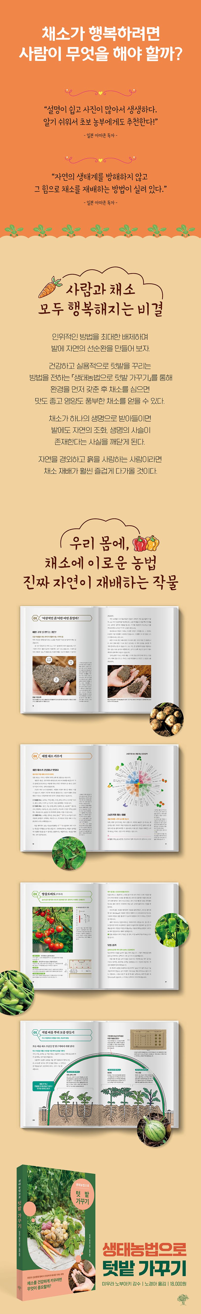 건강하고 실용적으로 텃밭을 꾸리는 방법을 전하는 『생태농법으로 텃밭 가꾸기』는 다양한 작물을 기르는 방법뿐 아니라, 밭의 기본이 되는 흙 만들기와 어떤 작물을 어떻게 심을지, 파종부터 수확 후 씨앗 채취까지 밭농사 전반에 관한 사항을 기초부터 다루어 초보자도 쉽게 텃밭 채소를 재배할 수 있도록 돕는다. 밭에서 채소를 관찰하며 하나하나 배우고 발견하는 기쁨을 누릴 수 있을 것이다.