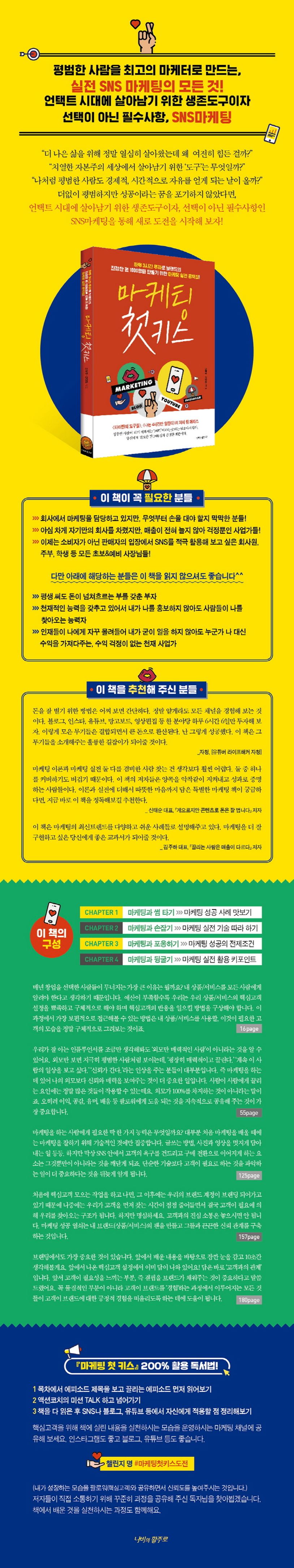 책 『마케팅 첫 키스』는 더없이 치열한 현대사회에서 살아남기 위한 생존도구이자, 성공을 위한 필수사항, ‘SNS마케팅’의 모든 것을 담고 있다. 마케팅을 담당하고 있지만 막막하기만 한 회사원부터 매출 때문에 고민이 많은 사업가들까지, 이제는 소비자가 아닌 판매자의 입장에서 SNS를 적극 활용하고자 하는 회사원, 주부, 학생 등 모든 초보&예비 사장님까지! 그 누구나 쉽게 이해하고 바로 실전에 응용할 수 있는 ‘SNS마케팅’ 기법을 상세히 소개해 나간다. ‘유튜브에서 블로그까지, 인스타그램에서 페이스북까지’ 저자들이 몸소 체득한 ‘성공 노하우’들이 다양한 사례를 통해 곳곳에서 빛을 발하고 있다.