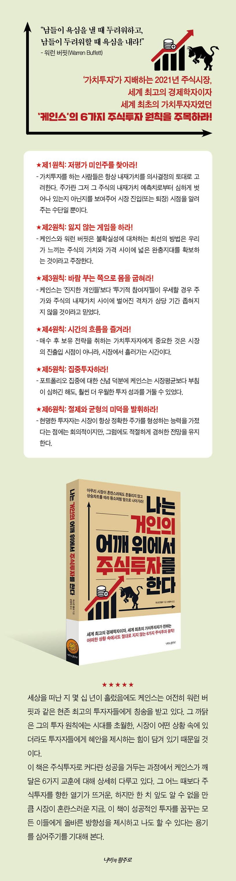 세상을 떠난 지 몇 십 년이 흘렀음에도 존 메이너드 케인스는 여전히 워런 버핏과 같은 현존 최고의 투자자들에게 칭송을 받고 있다. 그 까닭은 그의 투자 원칙에는 시대를 초월한, 시장이 어떤 상황 속에 있더라도 투자자들에게 혜안을 제시하는 힘이 담겨 있기 때문일 것이다.