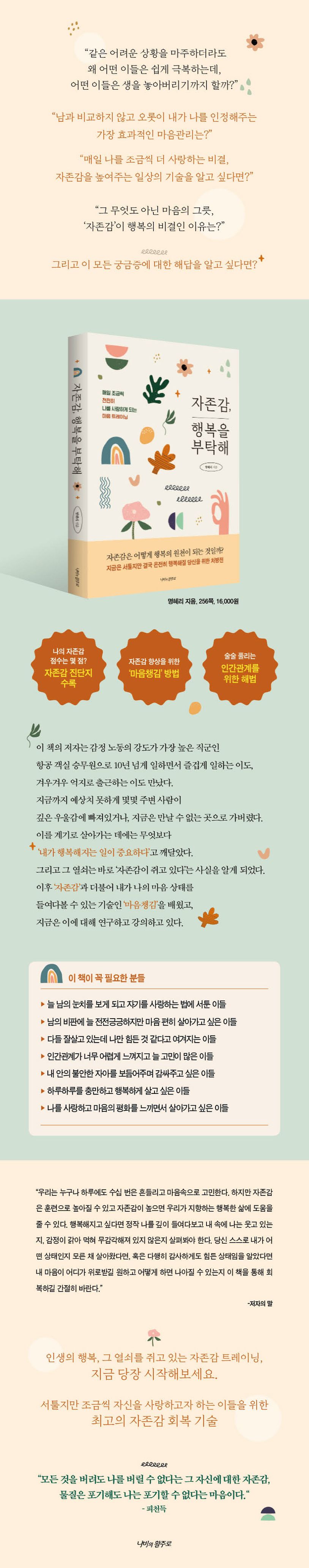 이 책의 저자는 감정 노동의 강도가 가장 높은 직군인 항공 객실 승무원으로 10년 넘게 일하면서 즐겁게 일하는 이도 겨우겨우 억지로 출근하는 이도 만났다. 지금까지 예상치 못하게 몇몇 주변 사람이 깊은 우울감에 빠져있거나, 지금은 만날 수 없는 곳으로 가버렸다. 그래서 살아가는 데에는 무엇보다 ‘내가 행복해지는 일이 중요하다’ 고 깨달았다. 그리고 그 열쇠는 자존감이 쥐고 있다는 사실을 알게 되었다.