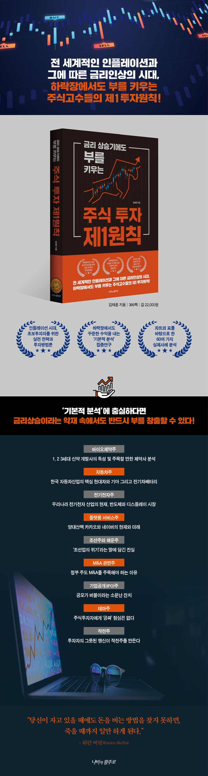 책 『금리상승기에도 부를 키우는 주식 투자 제1원칙』은 제목 그대로 대세 하락기에 접어든 주식시장에 살아남는 것은 물론, 이익을 창출하는 법에 대해 상세히 담고 있다. 20년 이상 투자시장에서 몸담고, 현재는 경영컨설팅 전문업체 대표로 활약 중인 저자의 평생 연구를 집약한 책이다. 금리인상기라는 악재를 현명하게 이겨내기 위해 꼭 필요한 ‘기본적 분석’법을 중심으로, 다양한 사례에 바탕을 둔 분야별 투자 노하우를 제시하고 있다.