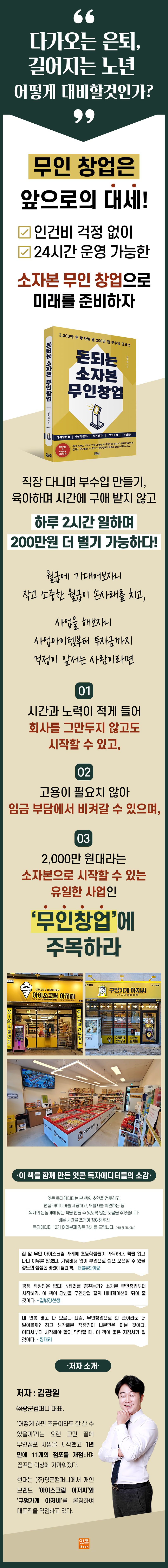 월급에 기대어보자니 작고 소중한 월급이 손사래를 치고, 사업을 해보자니 사업아이템부터 투자금까지 걱정이 앞서는 사람이라면, 시간과 노력이 적게 들어 회사를 그만두지 않고도 시작할 수 있고, 고용이 필요치 않아 임금 부담에서 비켜갈 수 있으며, 2,000만 원대라는 소자본으로 시작할 수 있는 유일한 사업인 ‘무인창업’에 주목하라.