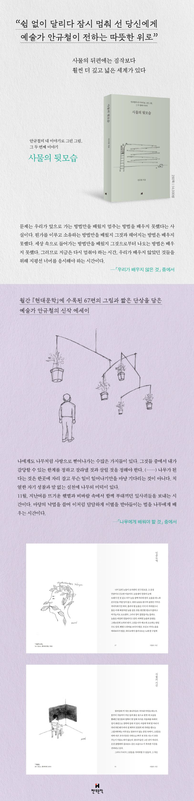 『사물의 뒷모습』이 《현대문학》에서 출간되었다. 조각가, 예술가라는 장르를 뛰어넘어 사물과 형상, 나아가 자신의 삶의 태도와 사유를 소박하고 순수하게 표현한 안규철의 에세이집이다. 그는 ‘내 이야기로 그린 그림’이란 제목으로 월간 《현대문학》에서 2010년부터 11년 간 연재해오고 있다. 그 첫 번째 책으로 2013년 출간된 『아홉 마리 금붕어와 먼 곳의 물』의 후속작인 『사물의 뒷모습』은 2014년 1월호부터 연재한 글과 그림 67편을 엮은 것이다.