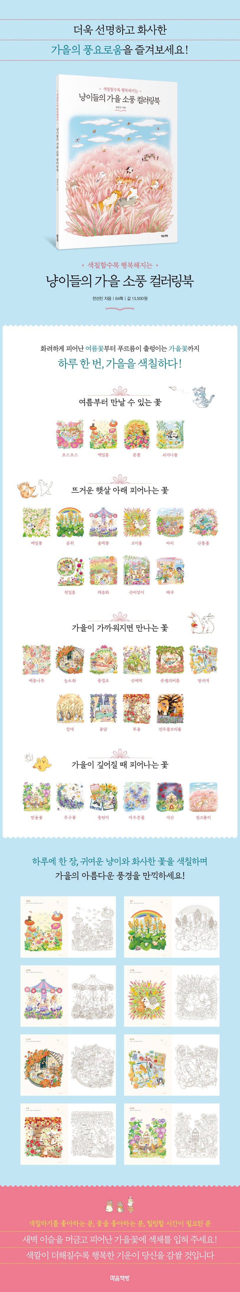 볼수록 기분 좋고, 색칠할수록 행복해지는 《냥이들의 가을 소풍 컬러링북》은 《봄날의 햇살 컬러링북》의 가을편입니다. 이번 가을편에는 세상을 아름답게 꾸며주는 꽃들의 향연 속에서 풍요로운 색채로 가득한 가을을 마음껏 즐기는 귀여운 냥이들과 판다, 토끼, 생쥐 친구들의 즐거운 풍경을 담았습니다. 구성은 여름을 거쳐 초가을에 피는 꽃부터 무르익은 가을에 피는 꽃까지 총 30종을 개화 시기에 따라 4가지 파트로 나누었습니다.
