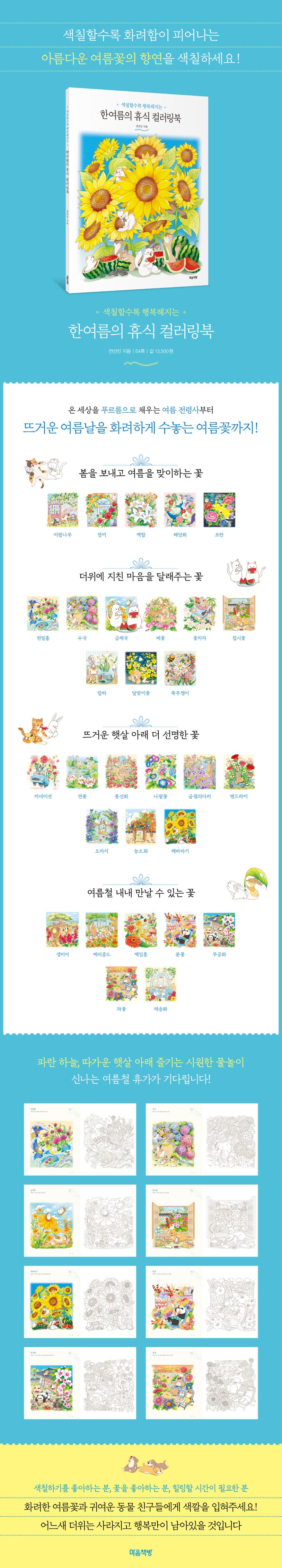 ‘색칠할수록 행복해지는’ 시리즈 여름편 《한여름의 휴식 컬러링북》은 뜨거운 여름날에 한껏 피어난 다채로운 꽃들과 더운 날씨에도 즐겁게 노는 동물들이 어우러진 귀여운 컬러링북입니다. 수국, 나팔꽃, 무궁화, 능소화, 해바라기 등 늦봄부터 여름철 내내 피는 꽃들 총 30종을 소개하면서 강렬하면서도 시원한 여름 풍경을 담아냈습니다.