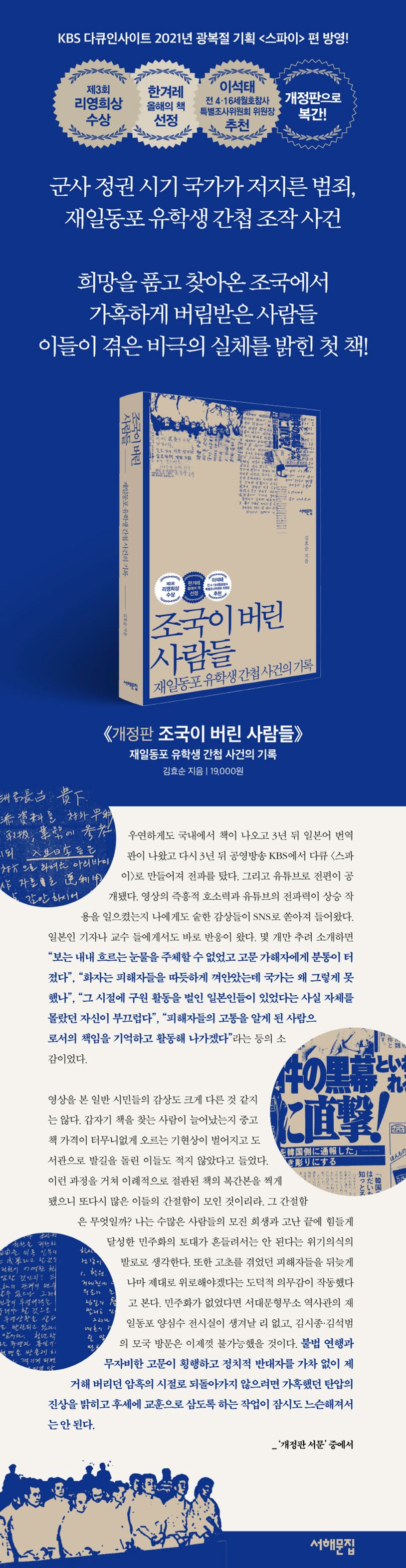 이 책은 이처럼 조국을 찾았다가 가혹한 비극을 겪을 수밖에 없었던 재일동포들, 그중에서도 간첩으로 몰렸던 재일동포 유학생 간첩 조작 사건의 실체를 파헤치는 노력의 산물이다. 2015년 초판 발행 이후, 여러 언론과 시민사회의 주목을 받았지만 널리 알려지지 못하고 절판되는 운명을 맞아야 했다. 하지만 이 책에 대한 관심은 꾸준히 이어졌고, 2021년 ‘KBS 다큐인사이트’에서 광복절 기획으로 방송한 〈스파이〉가 화제가 되면서 다시 한 번 사람들의 관심을 받게 됐다. 그에 힘입어 이렇게 개정판으로 다시 출간하기에 이르렀다.