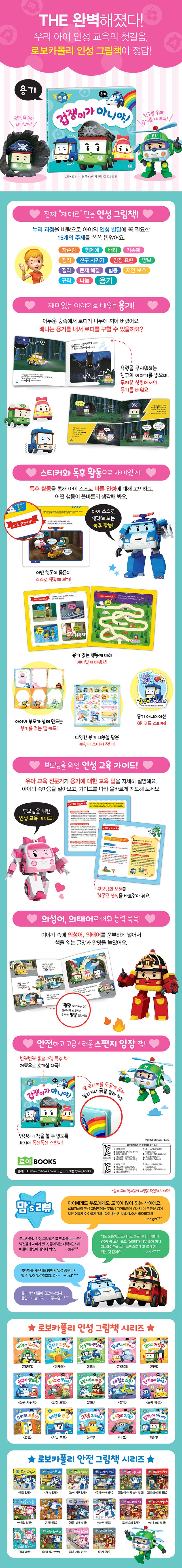 《로보카폴리 인성 그림책》 시리즈는 누리 과정을 바탕으로 아이의 인성 발달에 꼭 필요한 15개의 주제를 쏙쏙 뽑아 만들었어요. 그중 ‘용기’를 주제로 한 〈겁쟁이가 아니야!〉는 두려운 상황에서의 용기 있는 행동을 자연스럽게 보여 주고, 부모가 용기를 어떻게 교육해야 하는지 올바른 방향을 알려 주는 책이랍니다.