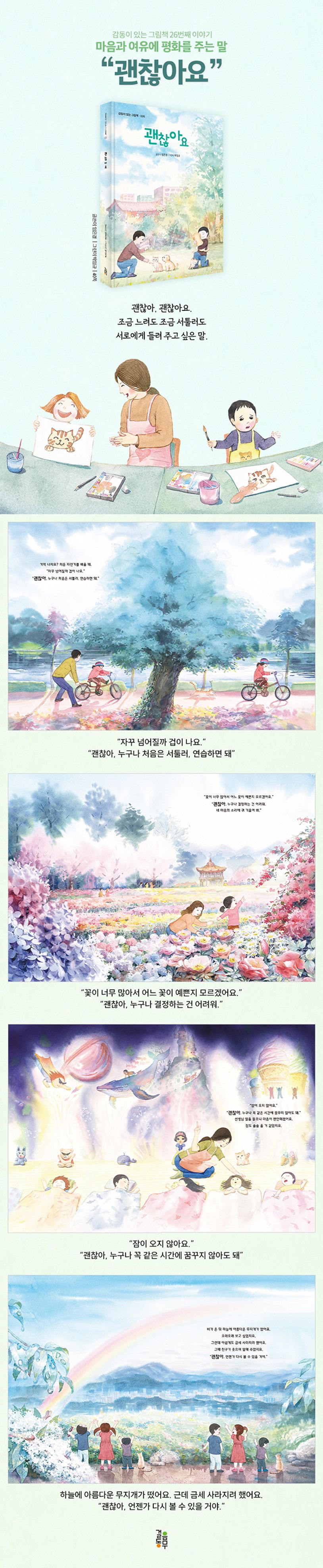 어린 시절 걸음마를 시작할 때 넘어지면 엄마는 늘 곁에서 다시 일으키거나 기다려 주며 “괜찮아.” 하고 말해 주었지요. 자전거를 처음 배울 때에도, 친구들은 다 꿈이 있는데 나만 꿈이 없을 때에도, 빨리 키가 크고 싶은데 잘 자라지 않을 때에도, 비 온 뒤 무지개를 더 보고 싶은데 눈앞에서 금세 사라질 때에도 우리는 아쉬움에 동동거리지요. 하지만 이제 조금 한 발짝 뒤로 물러서서 “괜찮아.” 하고 서로에게 말해 주면 어떨까요.