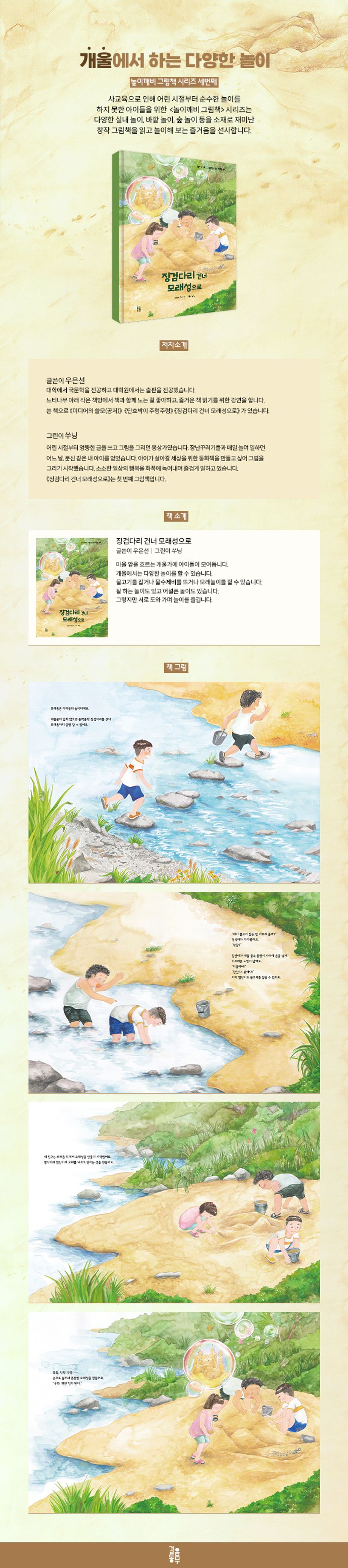 아이들이 개울에 있는 징검다리를 폴짝폴짝 건넙니다. 비가 많이 오지 않으면 개울가 모래톱에서는 놀 거리가 많습니다. 모래성 쌓기도 할 수 있고 물수제비도 뜰 수 있습니다. 또 물속에서 물고기들을 잡았다가 풀어 주기도 합니다. 아이들은 시간 가는 줄 모르고 재미있게 놉니다. 어떤 놀이가 가장 재미있는지 한번 구경해 볼래요?