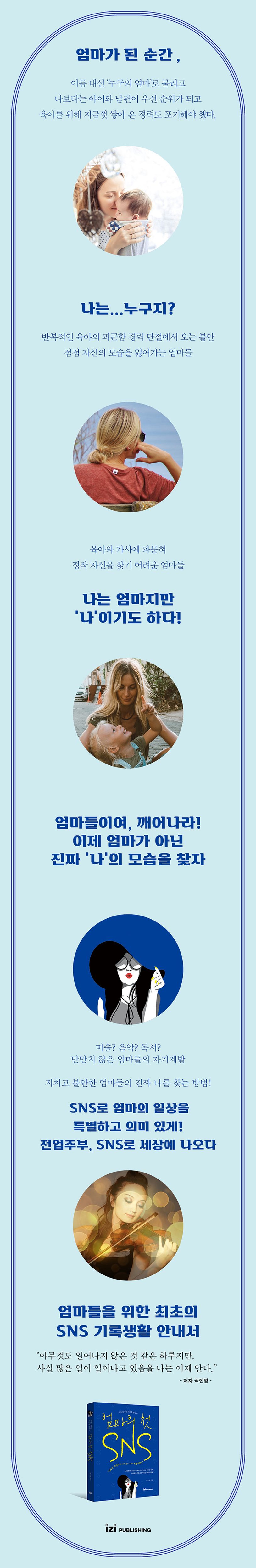 『엄마의 첫 SNS』는 육아에 휘둘리다 찌들어 버린 엄마의 자존감 지키기 프로젝트 도서다. SNS 공간으로 들어와 엄마라는 명찰을 떼고 오직 그 시간만큼은 ‘나’자신으로 돌아와 쉴 수 있도록 방법을 제시해 주는 책이기도 하다. 저자는 세 아이를 키우는 전업 주부로 여느 엄마와 똑같은 임신과 출산, 육아로 경단녀가 되었다. 결혼 전에 쌓아온 자신의 커리어가 사라졌고 ‘나’는 없고 ‘엄마’만 덩그러니 남은 시간을 보냈다.