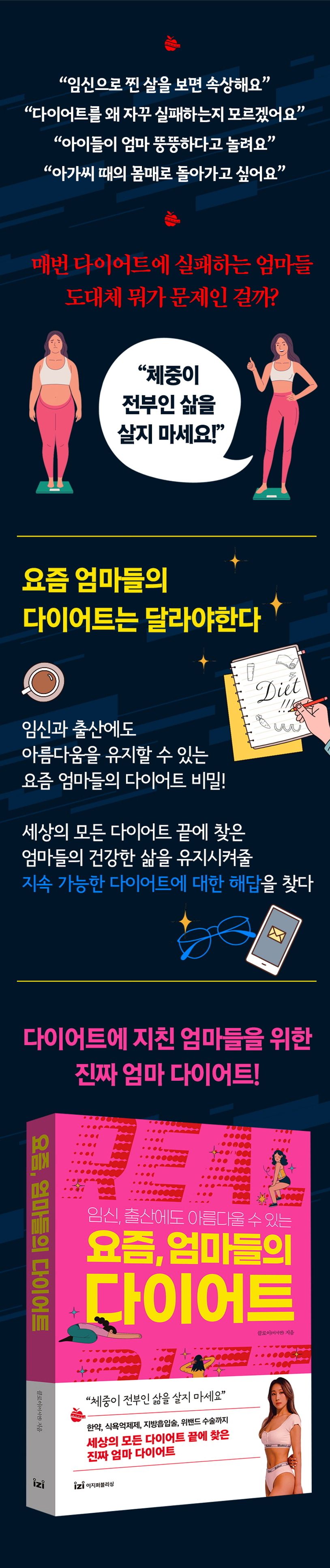 디톡스, 저탄수, 고지방 식이에서부터 한약, 식욕억제제, 지방흡입술, 위밴드 수술까지 세상의 모든 다이어트를 경험한 저자의 실패담으로 시작해 독자의 공감을 이끌어내며, 임신과 출산이라는 거대한 변화 뒤에 찾아온 다이어트 고비에 대해서도 진솔하게 털어놓는다. 엄마의 다이어트는 ‘체력’이라고 정의하는 저자는 체력을 키우고 피로의 근본 원인 파악하기, 근력 운동과 유산소 운동의 적절한 비율, 틈새 운동법까지 친절히 알려 주며 엄마들을 다이어트로 안내한다. 특히 저자가 엄마들에게 자주 들은 질문을 Q&A로 구성해 답하며 다이어트에 대한 궁금증을 속 시원히 해결해 준다.