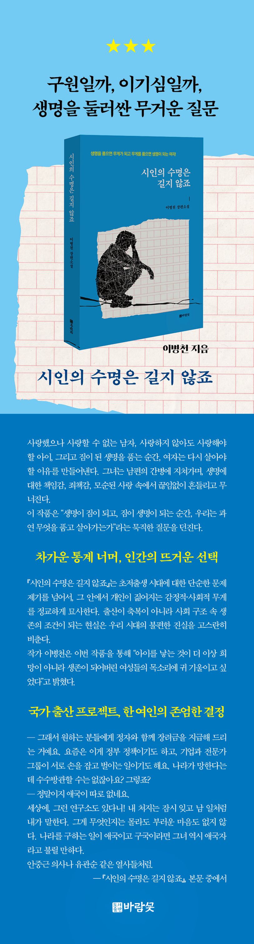 『시인의 수명은 길지 않죠』는 초저출생 사회의 현실 속에서 여성이 마주한 생존과 선택, 생명의 무게에 대한 근원적 질문을 집요하게 파고든다. 단순한 출산의 서사가 아니라, 생명의 무게와 여성의 자기 결정권, 가족의 해체와 재구성을 정면으로 응시하는 작품이다. 출산이 개인의 선택이 아닌 생존의 조건으로 바뀌는 현실을 통해, 오늘날 독자들에게 깊고 묵직한 울림을 전달한다.