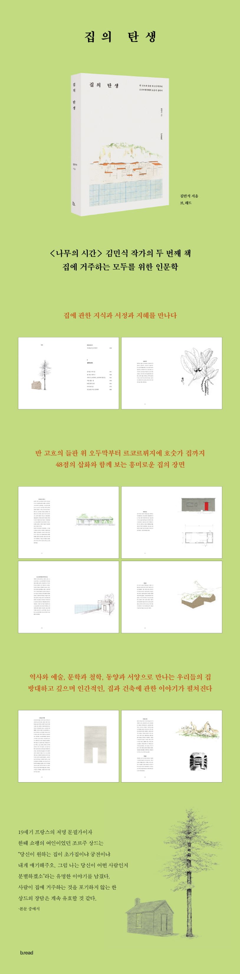 집이 재산으로 취급되는 시대, 우리들은 어떤 대답을 할 수 있을까. 세기의 건축가가 지은 집, 외딴 숲속 철학가의 오두막, 휘황찬란한 왕비의 궁전, 마주 앉으면 무릎이 맞닿는 시인의 집, 골목길에 즐비하던 아무개의 양철집, 그리고 아파트. 사람이 집에 거주하는 것을 포기하지 않는 한 집의 이야기는 계속되고, 상드의 장담은 유효할 것이다. 우리는 매일매일, 생의 마지막 순간까지 머무를 살갗 같은 집에 대해 무슨 고민을 시작해야 할까.