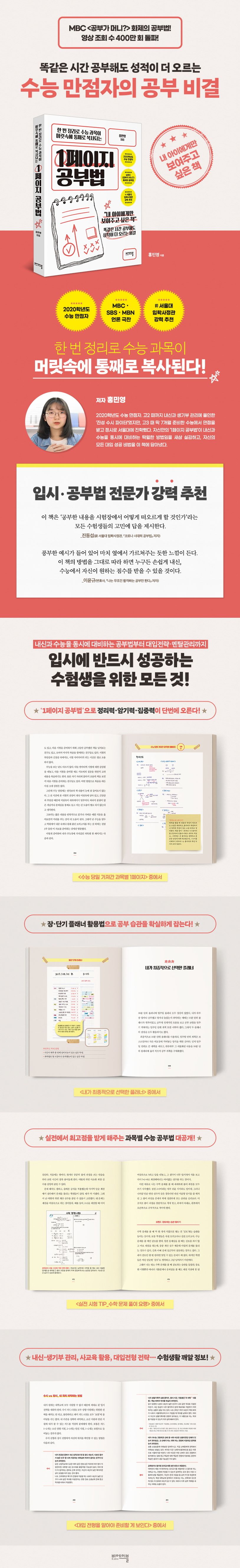 MBC 〈공부가 머니?〉 출연으로 큰 화제가 되었고, 방송 이후에도 해당 영상의 조회 수가 100만 회를 넘길 만큼 뜨거운 관심을 받은 2020학년도 수능 만점자 홍민영 학생의 공부법을 촘촘하게 담았다. 1부에서는 고3에 올라가 딱 7개월 준비한 수능에서 만점을 받고 서울대에 진학할 수 있었던 핵심 비법인 동시에 내신과 수능에 모두 통하는 ‘1페이지 공부법’과 ‘과목별 공부법’을 구체적으로 알려주고, 2부에서는 공부를 방해하는 슬럼프나 불안감 같은 심리적 요인과 여러 환경적 요인에 현명하게 대처하는 방법들을 상세하게 조언한다. 코로나로 학습 결손이 커진 요즘, 공부 효율을 최대로 끌어올리고 싶다면 반드시 읽어야 할 수험생 필독서이다.