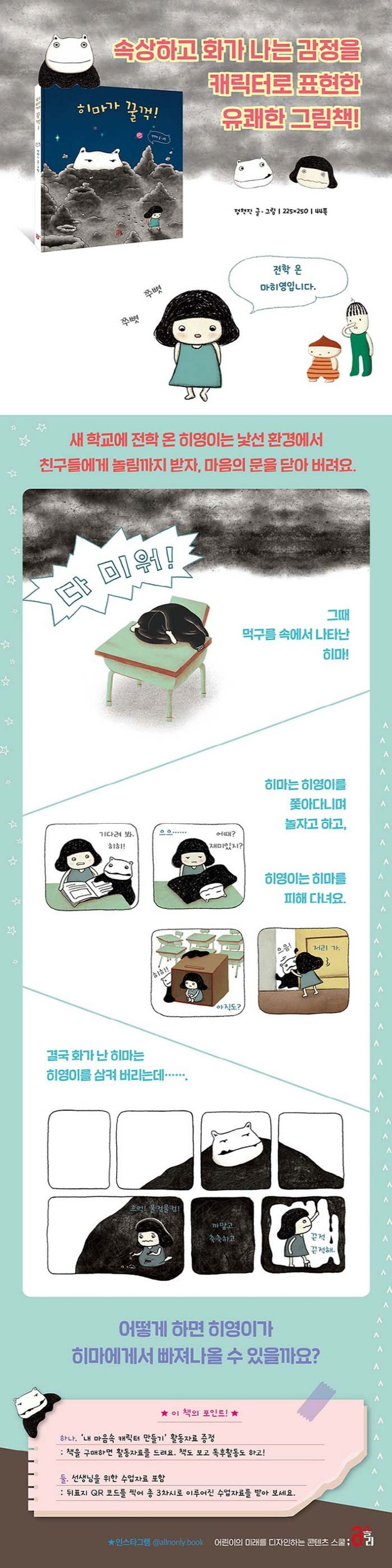 새 학교에 전학 온 마히영은 낯설고 긴장한 가운데 아이들의 놀림까지 받자 마음의 문을 닫아 버립니다. 우울하고 화난 감정으로 만들어 낸 먹구름 속에서 반짝, 히마가 나타납니다. 히마는 외로운 히영이에게 친구가 되어 준다며 다가가려고 하지만, 히영이는 이상한 모습에 제멋대로인 히마가 마음에 들지 않습니다. 자신을 피하는 히영을 보고 화가 난 히마는 히영이 아끼는 물건을 모조리 먹고 급기야 히영이까지 꿀꺽! 삼켜 버립니다. 과연 히영이는 히마에게서 빠져나올 수 있을까요?