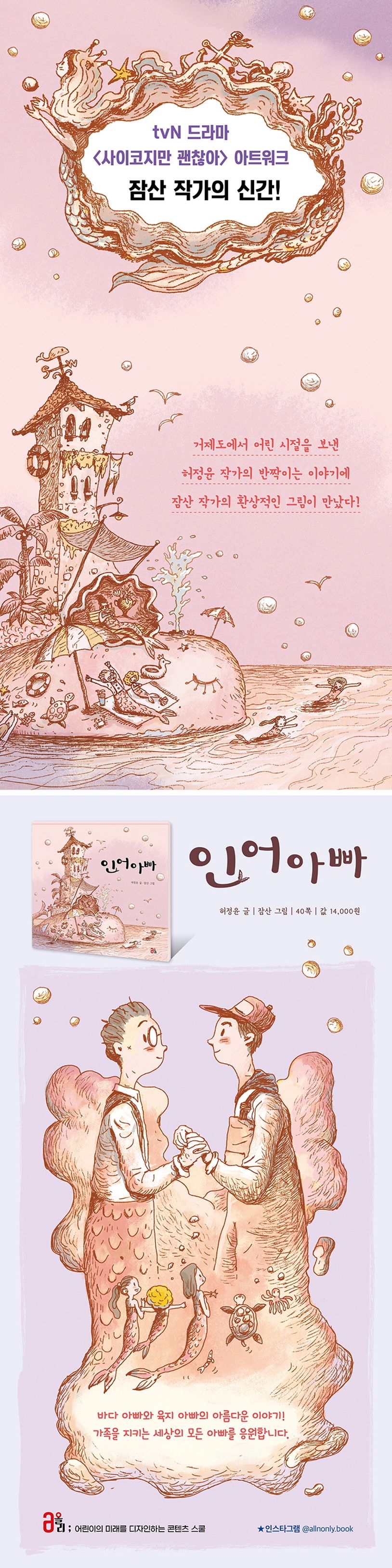 《인어아빠》는 지금까지 본 적 없는 새로운 인어 이야기입니다. 인어 공주의 이미지로만 각인되어 있던 인어의 새로운 모습들은 우리의 상상력 세계를 한층 더 넓혀 줄 것입니다.