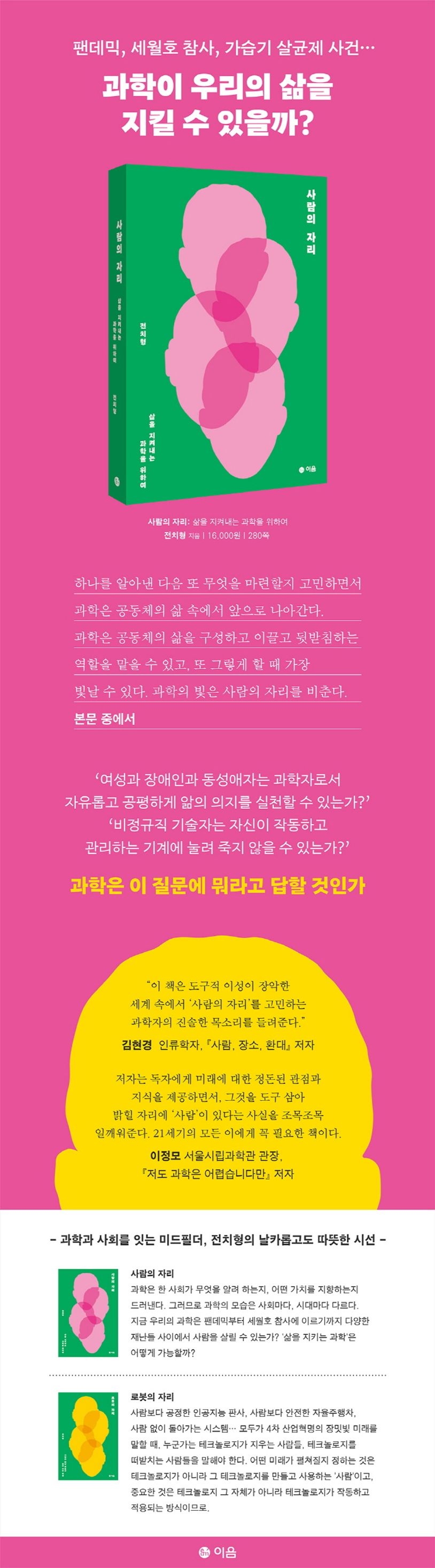 그중 첫 번째 책인 『사람의 자리: 삶을 지켜내는 과학을 위하여』는 과학이 수많은 재난 속에서 우리의 삶을 지키려면 어떤 모습을 하고 어디를 향해야 하는지 묻는다. 이를 위해 저자는 지난 5년간 『한겨레』, 『경향신문』 등 다양한 매체에 쓴 글들을 모았다. 지난 몇 년 동안 한국 사회가 과학기술을 통해 무엇을 “알아내고 마련하려” 했는지 관찰한 기록이다. 특히 2019년에서 2021년이 되는 동안 코로나19라는 예상하지 못한 변수는 우리가 사는 세계를 완전히 바꿔놓았다. 이번 개정확장판에는 저자가 지켜본 팬데믹 시대의 모습이 담긴 ‘코로나19 속 과학과 삶’이라는 장이 추가되었다.