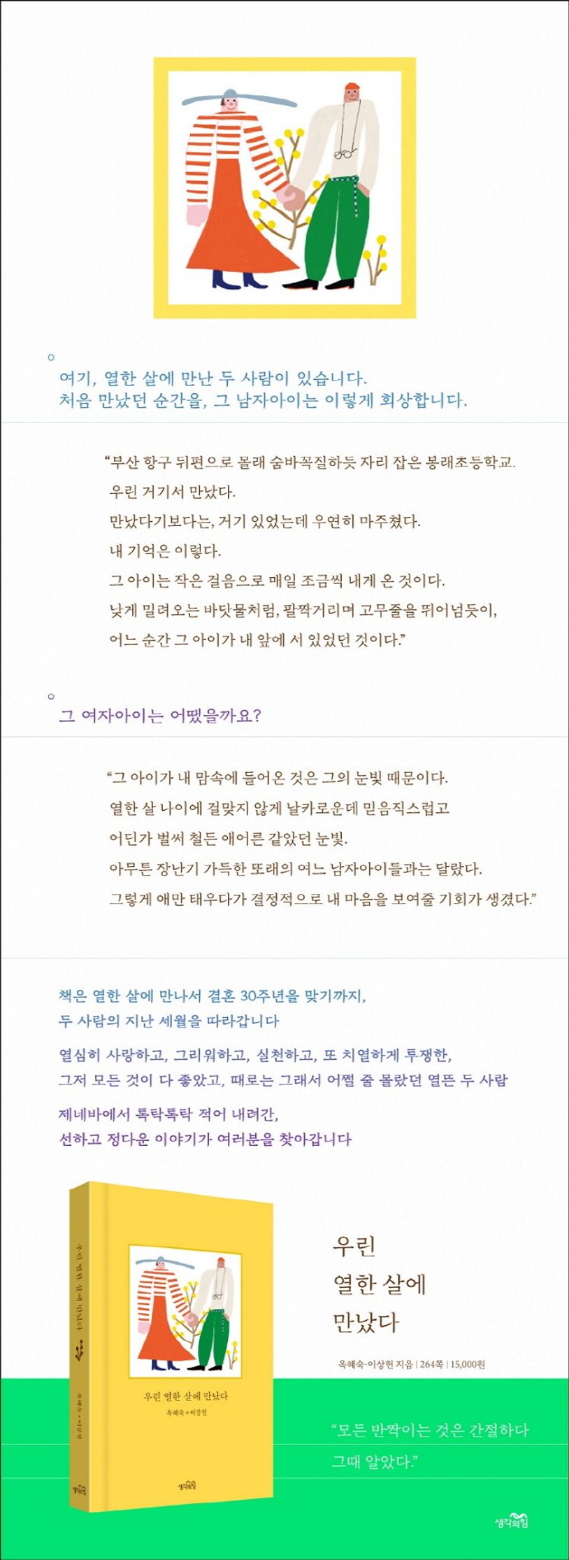 열한 살에 만나서 결혼 30주년을 맞기까지, 옥혜숙과 이상헌의 지난 세월을 따라가는 에세이다. 제네바에서 톡탁톡탁 적어 내려간, 선하고 정다운 이야기가 독자를 맞는다. 열심히 사랑하고, 그리워하고, 실천하고, 또 치열하게 투쟁한, 그저 모든 것이 다 좋았고, 때로는 그래서 어쩔 줄 몰랐던 열뜬 두 사람의 이야기가 한 걸음 한 걸음 펼쳐진다.