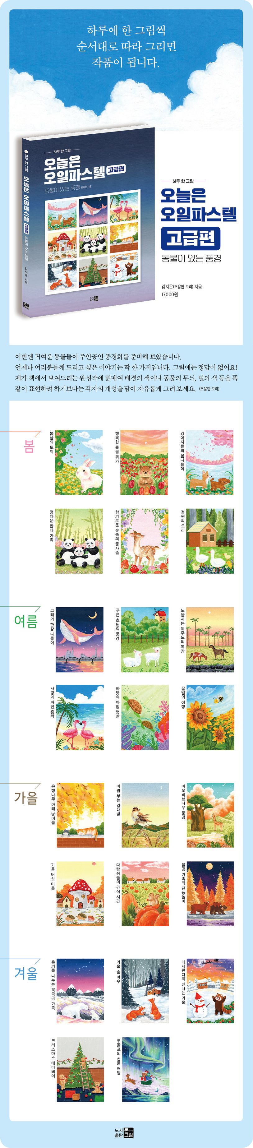 2021년 출간된 책 ‘오늘은 오일파스텔’을 많이 사랑해주신 덕분에, 이렇게 고급편까지 보여드릴 수 있게 되었어요. 이번엔 어떤 그림으로 여러분을 즐거운 취미생활로 이끌어드릴 수 있을까 고민하다가, 귀여운 동물들이 주인공인 풍경화를 준비해 보았습니다.
