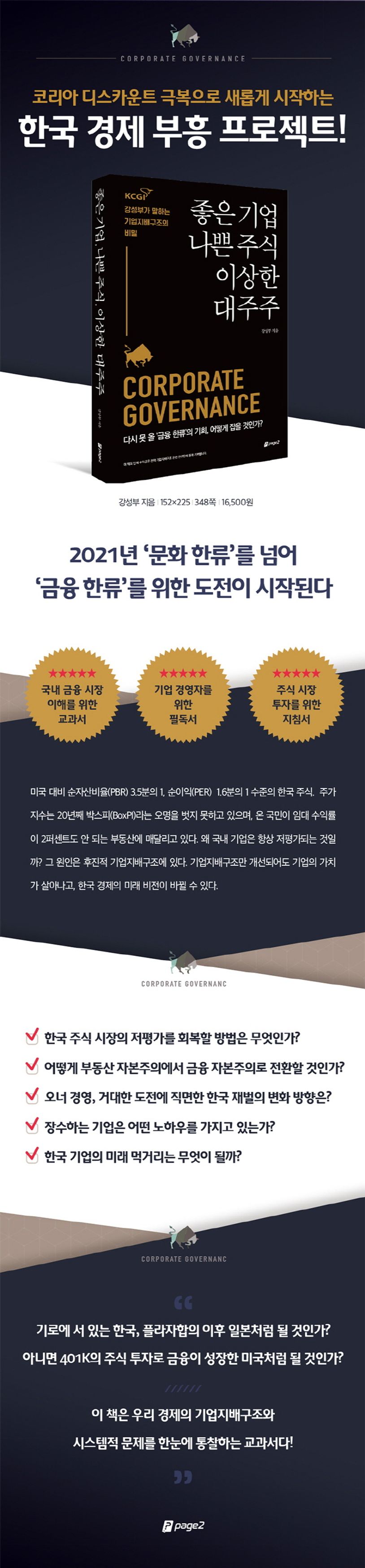 한국 사회 대부분의 가계 자산은 부동산에 묶여 있다. 많은 사람들이 수억 원의 부채를 앉고 집을 사서 자신의 집값이 오르기만을 바라고 있다. 부동산 정책에 따라 경제가 좌우되며, 정권의 지지율도 급등락한다. 하지만 우리 경제가 올바로 성장하기 위해서는 부동산이 아니라 기업으로 돈이 흘러들어야 한다. 즉, ‘부동산 자본주의’에서 ‘금융 자본주의’로 전환이 필요한 시점이다. 그러기 위해서는 한국 경제의 고질적인 문제, 코리아 디스카운트를 해결해야만 한다. 이 책은 우리 경제가 금융 자본주의로 신속히 전환하기 위한 방법과 ‘코리아 디스카운트’를 해결하기 위한 방법, 그리고 미래 산업의 먹거리에 대한 전망 등을 제시한다.