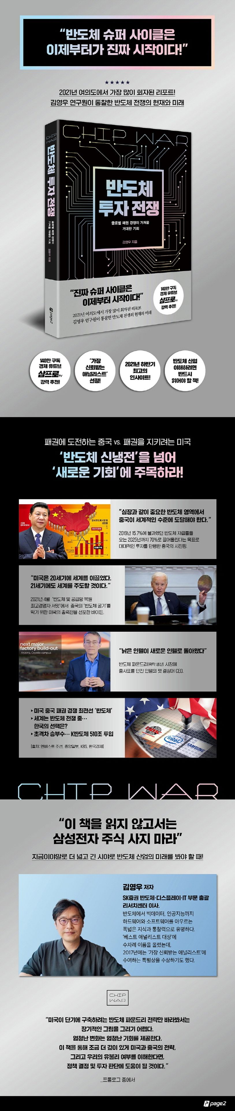 엄청난 변화는 엄청난 기회를 가져오기 마련이다. ‘한국에서 가장 신뢰할 수 있는 애널리스트’이자 2021년 여의도에서 가장 많이 회자된 리포트의 주인공이기도 한 SK증권의 김영우 이사는 『반도체 투자 전쟁』을 통해 지금 시점에서 반드시 주목해야 할 반도체 전쟁의 현재와 미래를 통찰했다. 이 책을 통해 더 깊이 있게 미국과 중국의 전략을 이해하고, 이 전쟁이 반도체 산업에 미치는 영향을 파악해본다면, 우리 정책의 방향성은 물론 투자자들에게 찾아온 커다란 기회가 무엇인지도 분명하게 보일 것이다.