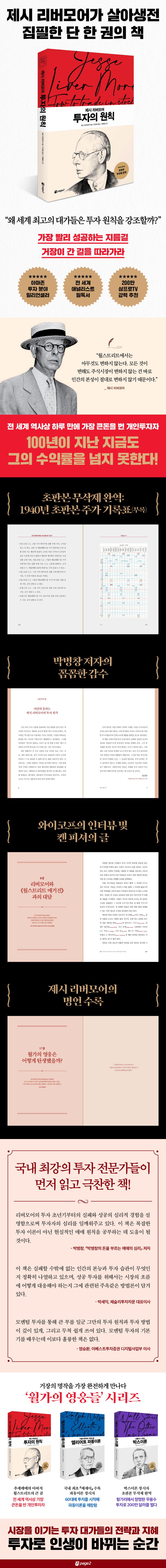 또한 그 당시 성공한 투자자이자 《월스트리트 매거진》의 발행인이며 에디터인 리처드 와이코프가 리버모어를 인터뷰한 글들을 엮어 편집한 『제시 리버모어 투자의 기술』과 켄 피셔의 『시장을 뒤흔든 100명의 거인들』에서 소개한 리버모어를 소개한다. 이 책을 통해 독자들은 리버모어와 그의 투자 원칙을 입체적으로 파악하고 자신만의 투자 원칙을 정립하는 데 많은 도움을 받을 것이다.