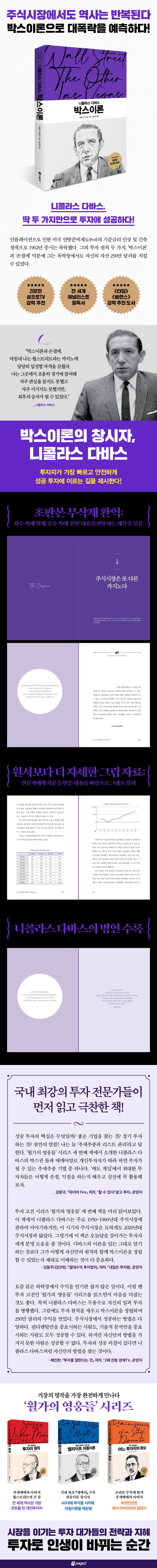 가장 완전한 투자고전 시리즈 ‘월가의 영웅들’ 세 번째 도서 『니콜라스 다바스 박스이론』이 출간됐다. 미국에서 출간되자마자 40만 부가 팔렸던 『나는 주식투자로 250만불을 벌었다』의 후속작이며, 특히 이 책은 중고시장에서 최고 16만 원까지 판매되는 『어메이징 박스이론』을 복간한 책이기도 하다.