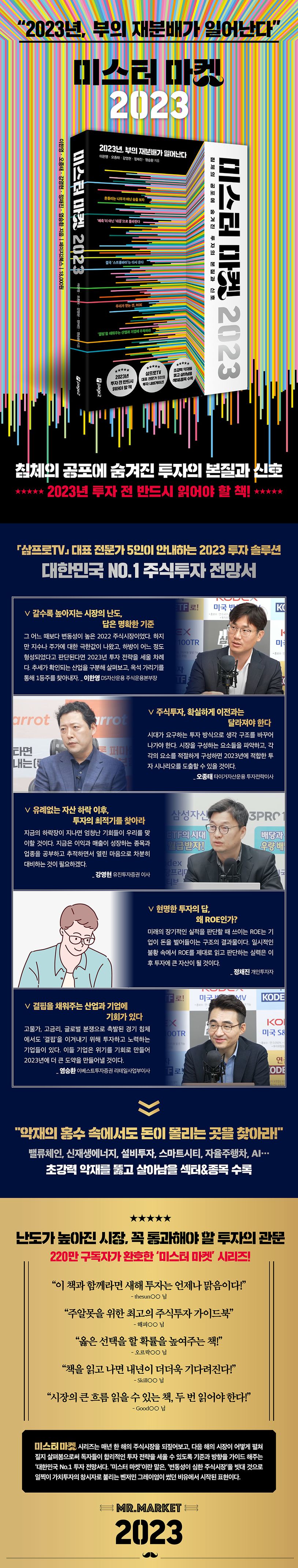 세 번째 미스터 마켓 시리즈를 위해 최고의 주식투자 멘토들이 모였다. 5명의 필진은 각기 다른 포인트와 다른 메시지로 2022 주식시장을 복기하고 2023 주식시장을 예측했으며 투자자들에게 꼭 필요한 투자 마인드와 기준점을 전달한다. 이 책 한 권만으로 투자를 제대로 공부하고 2023년 시장에 대응하기 충분할 것이다. 변화의 모멘텀, 투자 아이디어까지 총망라하고 있어 독자들이 더 깊고 넓은 스펙트럼으로 시장을 바라볼 수 있는 든든한 가이드가 되어 준다.