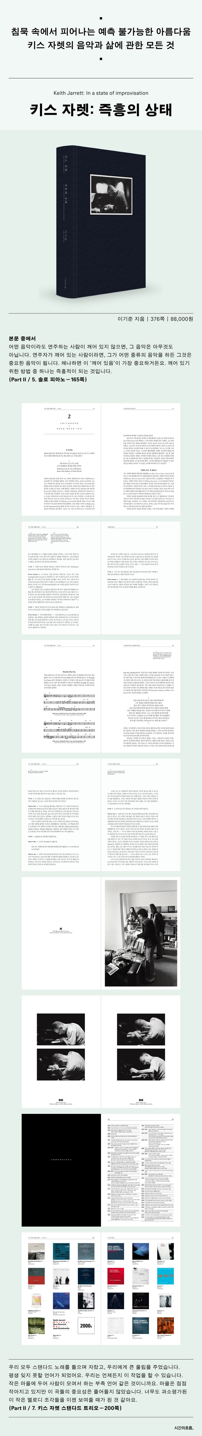 『키스 자렛: 즉흥의 상태』는 저자 이기준이 재즈의 본고장 뉴욕에서 30년 넘게 키스 자렛을 연구해오며 그의 최측근들을 만나 직접 인터뷰해서 아카이빙한 방대한 자료들을 담은 책이다.