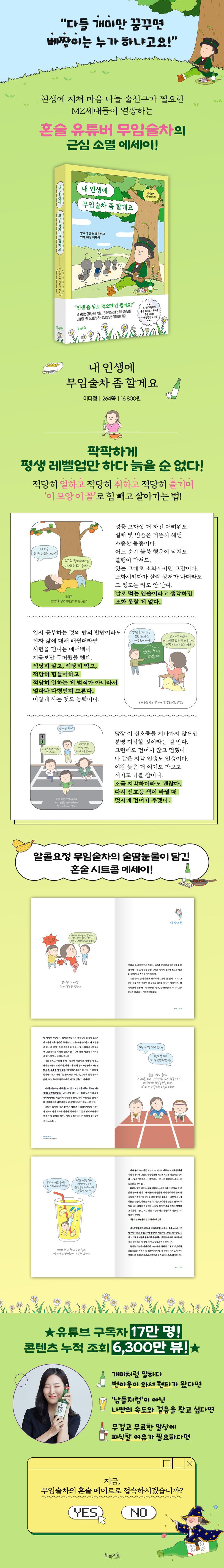 어디로 튈지 모르는 엉뚱함, 고급진 푼수미와 해맑은 광기, 그리고 긍정 마인드로 17만 구독자에게 사랑을 받은 방구석 프로 혼술 유튜버 무임술차 이다정의 첫 책 《내 인생에 무임술차 좀 할게요》가 출간됐다. 오전 9시, 편의점에서 모닝 소주를 달리며 “숨 참고 소주 다이브~♪”를 외치는 무임술차의 등장은 그야말로 센세이션 했다. 팍팍한 현생에 지쳐 마음 나눌 술친구가 필요한 사람들에게 조곤조곤 웃기는 입담과 유쾌발랄한 매력으로 다가간 무임술차는 단숨에 17만 구독자를 사로잡았다. 한 편의 시트콤을 보는 듯한 무임술차의 일상은 웃을 일 없고 외로운 혼술러들에게 큰 웃음을 주고 위안이 되었다. 그리고 그녀는 금세 국내 혼술 유튜버 1위가 되며 누적 조회수 6,300만 뷰를 달성하는 쾌거를 이뤘다.