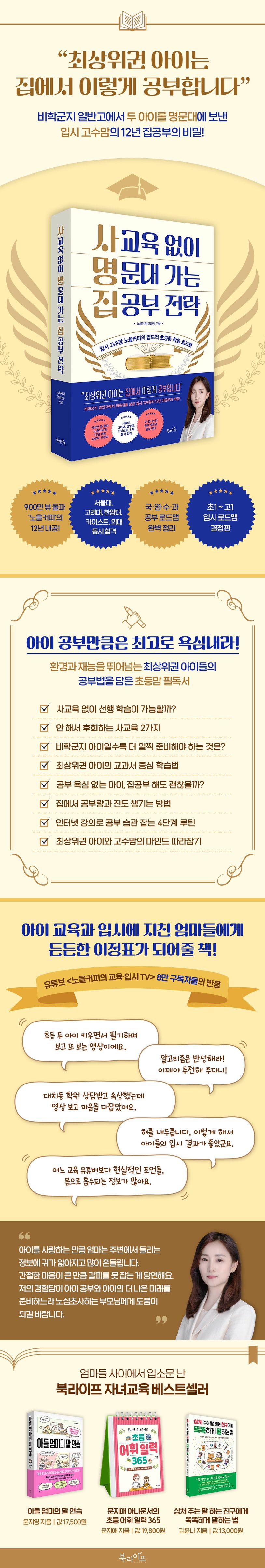 사교육을 이기는 최상위권 아이는 어떻게 공부할까? 입시 성공기와 유명 학군지 공부법은 사방에 넘쳐난다. 중요한 건 우리 아이가 실천할 수 있느냐의 여부다. 《사교육 없이 명문대 가는 집공부 전략》은 유튜브 ‘노을커피의 교육·입시tv’를 운영하는 입시 고수맘이 쓴 책이다. 저자는 초중고 12년간 두 아이를 집에서 직접 공부시켜 비학군지 일반고에서 명문대를 보냈다. 책에서 저자는 두 아이와 숱한 시행착오를 겪으며 차곡차곡 쌓아온 실전에 강한 집공부 방법과 입시 전략을 모조리 공개한다.