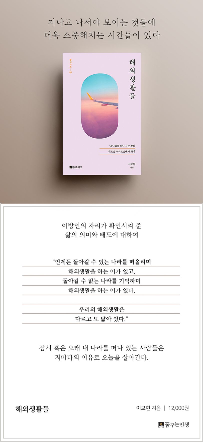 〈해외생활들〉은 들시리즈 다섯 번째 책으로, 십여 년의 해외생활이 가져다준 웃음과 눈물에 관한 이야기이다. 호기롭게 시작한 유학 생활에서 언어와 인종, 문화의 벽은 생각보다 높고, 만났던 모든 이가 다정한 관계로 남지도 않았다. 저자의 표현을 빌리자면 해외생활의 결과물 또한 온전치 못하다. 그럼에도 저자가 자신의 해외생활을 ‘소중하다’고 말하며 그 시절에 고마워하는 것은 그 시간들이 확인시켜 준 삶의 의미와 태도 때문이다. 가령 저마다의 삶이 있다는 것, 진중하게 시간을 대하는 법, 편견 없이 사람을 마주하는 자세, 부정적인 감정에 맞서는 힘 같은 것들. 삶의 자리가 어디든 우리가 알고 갖춰야 하는 것들임이 분명하다.