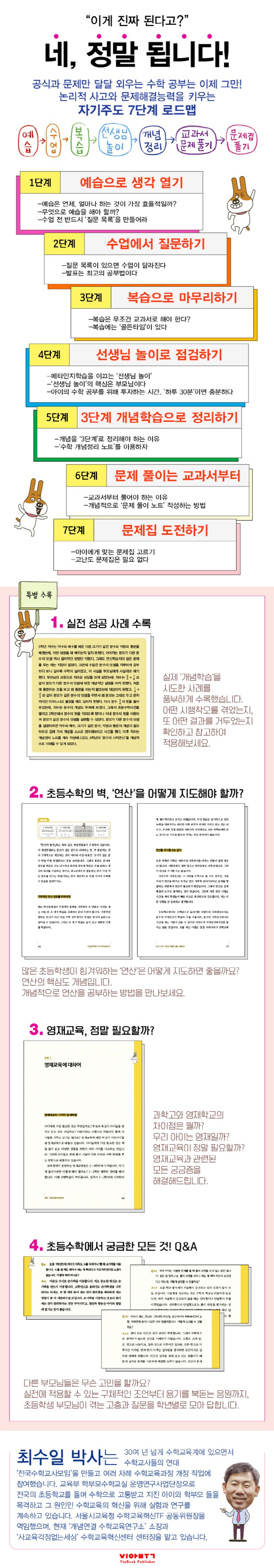 사교육 없이도 수학 공부가 가능하다고 외치는 이 책의 등장은 그래서 더욱 반갑다. 점점 늘어만 가는 사교육비 부담과 뒤처지고 있다는 불안감의 소용돌이 속에서, 저자는 “지금 공부하는 게 수학이 맞냐”는 질문을 던지며 논의를 최초로 되돌린다. 왜 아이를 학원에 보내도 수학 점수가 오르지 않을까? 열심히 하는 것 같은데도 왜 늘 같은 문제를 틀릴까? 학원을 다니지 않으면 뒤처지는 게 아닐까? 학교를 나가지 못한 만큼 사교육으로 학습 격차를 메워야 하지 않을까? 저자는 문제의 핵심이 ‘사교육 유무’가 아니라, 근본적인 ‘공부 방법’에 있다고 지적한다. 그리고 벌어진 학습 격차를 극복하는 유일한 열쇠는 ‘자기주도학습’이라고 말한다.