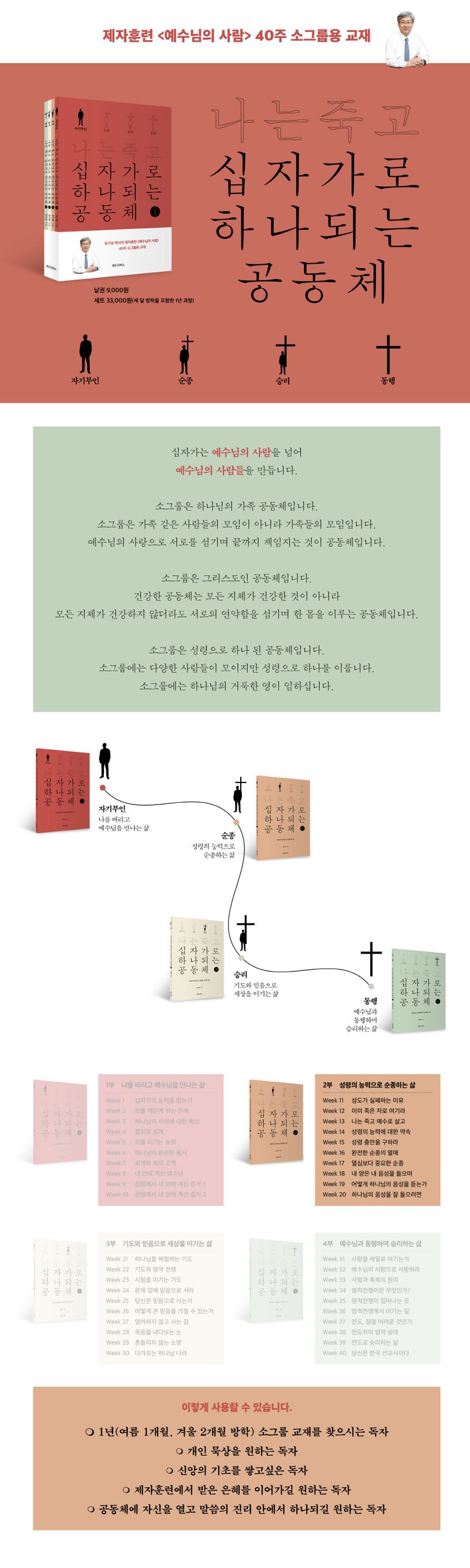 《나는 죽고 십자가로 하나되는 공동체》는 스테디셀러 제자훈련 교재인 《예수님의 사람》을 바탕으로 한 소그룹 교재다. 매주 10페이지가 안 되는 분량의 말씀을 통해 개인을 돌아보고 나눔을 통해 서로에게 말씀하시는 하나님을 발견하게 된다. 나는 죽고 십자가로 하나되는 공동체를 함께 훈련하는 책이다. 공동체의 부흥은 양적 부흥이 아니라, 공동체가 얼마나 주님의 임재를 알고 주님의 말씀에 순종하는지에 따라 질적으로 일어난다. 십자가의 복음은 사랑이 충만하고, 거짓이 없고, 정결하고, 겸손하며, 기쁨이 있는 공동체를 분명히 만든다.