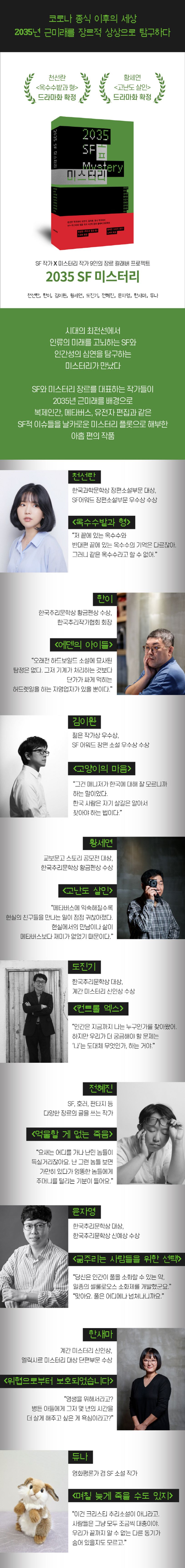시대의 최전선에서 인류의 미래를 고뇌하는 장르인 SF와 인간성의 심연을 탐구하는 미스터리가 만났다. 코로나19의 여파를 통과한 가까운 미래의 모습을, 각 분야를 대표하는 작가들의 뛰어난 장르적 상상력으로 조망해보자는 의도로 시작된 이 프로젝트는 복제인간, 난민 수용, 게놈 에디팅(genome editing), 텔레포트, 메갈로폴리스 등의 변수가 우리 세계에 끼어들었을 때 어떤 일들이 벌어질 수 있는지를 최전선에서 보여준다.