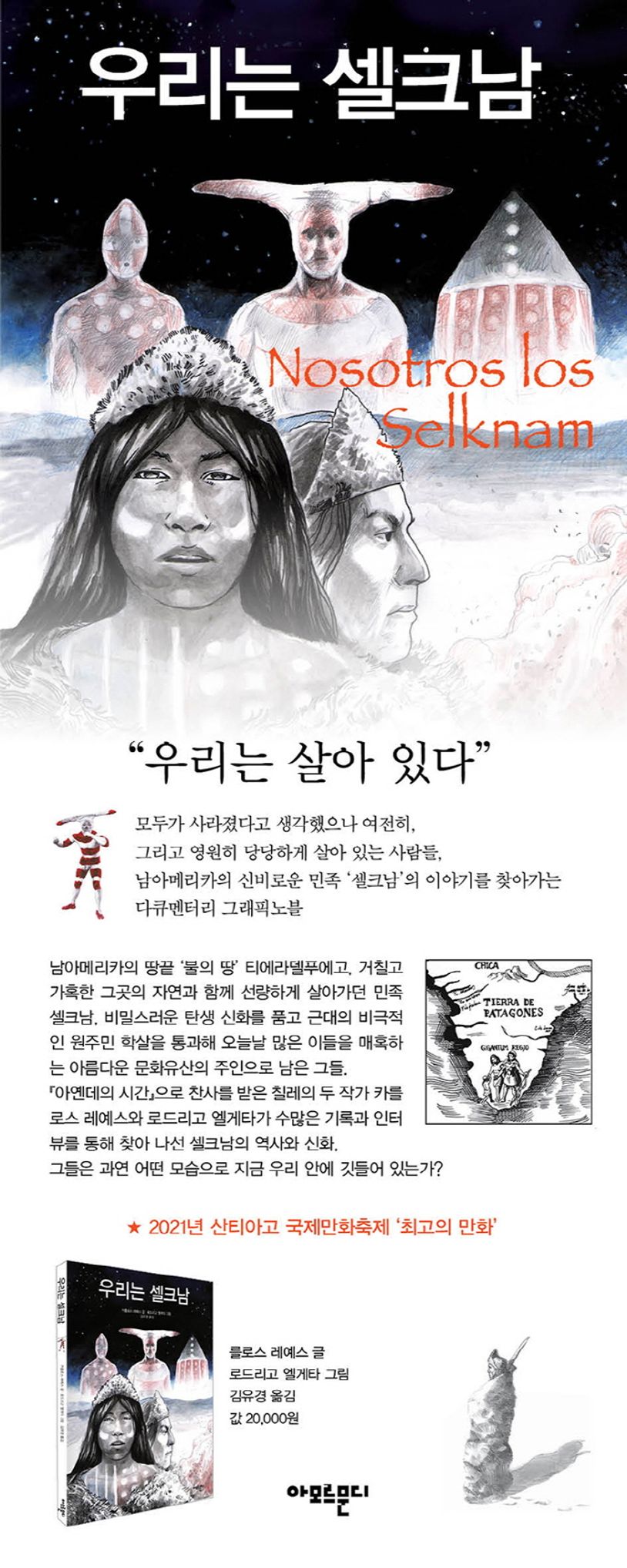 최근 십여 년 전부터 칠레에서는 셀크남의 문화적 가치가 새로이 조명을 받고 있다. 그들의 신비로운 탄생 신화, 독특하고 마술적인 성인식인 ‘하인’, 그리고 또 다른 유무형의 아름다운 유산들까지…. 20세기 서양 식민자들이 남긴 기록의 관점을 벗어나, 셀크남을 비롯한 원주민의 정체성과 뿌리를 탐색하려는 움직임이 활발히 일고 있다. 『우리는 셀크남』은 바로 그러한 움직임의 한가운데에서 뛰어난 두 작가가 탄생시킨 작품이다.