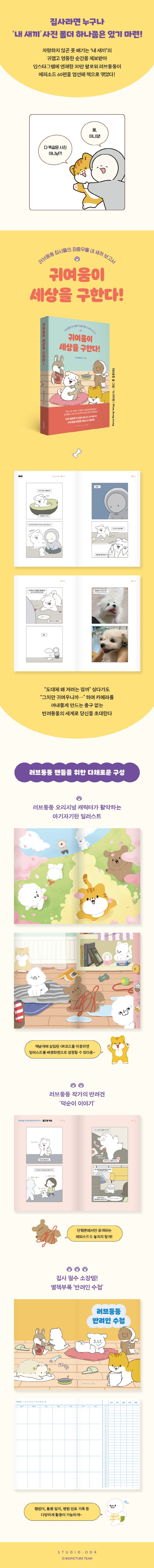 《귀여움이 세상을 구한다!》는 러브둥둥이 엄선한 제보툰 에피소드 60편이 담긴 하이라이트 모음집이다. 반려동물과의 첫 만남부터 이별까지, 반려동물에게 감동받은 순간부터 황당하고 유쾌한 일화까지 사랑스러운 에피소드가 넘쳐나는 집사들의 따뜻하고 명랑한 일상은 독자들의 마음을 무장해제시킨다. 《귀여움이 세상을 구한다!》에는 이제껏 한 번도 공개된 적 없는 러브둥둥 오리지널 캐릭터 일러스트가 담겨 있으며, 작가의 반려견 ‘덕순이 이야기’가 장마다 수록되어 감상에 재미를 더한다. 또한 반려동물의 병원 진료 기록 및 간단한 일정을 기록할 수 있는 ‘반려인 수첩’을 별책부록으로 선사한다.